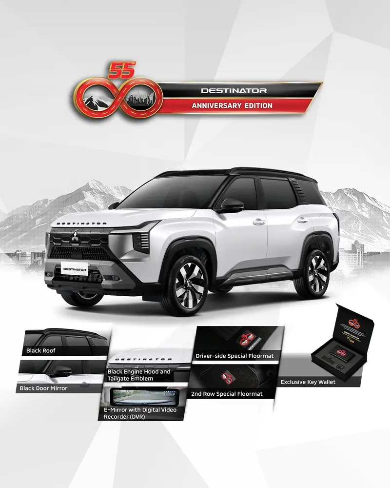 另一款登场的纪念车型则是七人座SUV Destinator的55周年特别版本。这款车定位更偏向家庭与长途使用需求,因此在舒适与配备方面进行了更为细致的强化。外观同样采用Quartz White Pearl搭配黑色车顶,整体造型稳重中带有时尚感,延续三菱近年强调的现代SUV设计语言。