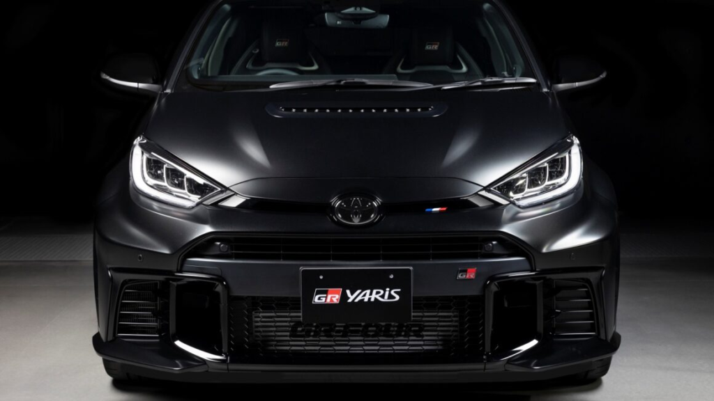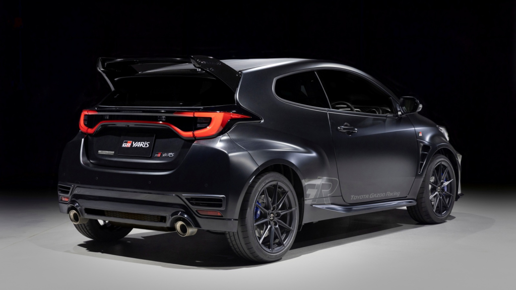 在外观设计上,这款特别版与一般 GR Yaris 形成明显区隔。整车采用专属的深色涂装,搭配完整的 Aero Performance 空力套件,包括更具攻击性的前下扰流、前叶子板导流孔、重新设计的侧裙以及可调式大型尾翼。这些并非单纯为了视觉效果而存在,而是直接呼应拉力赛车在高速稳定性与空气导流上的需求。雾面黑色轮圈配合高性能刹车系统,蓝色卡钳在深色车身映衬下显得格外醒目,让整车散发出强烈的竞技气息。