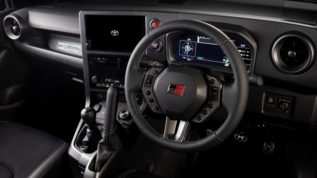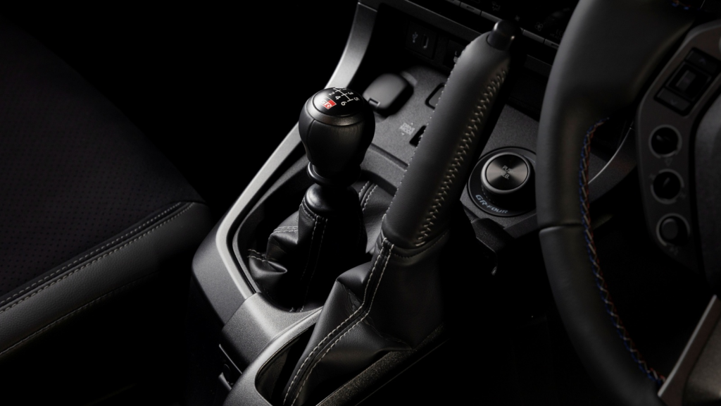车内同样围绕“拉力精神”展开。驾驶舱采用更偏向赛车风格的配置,方向盘造型与 GR Rally 赛车设计理念接近,握感与操控取向明显偏向激烈驾驶。内饰缝线以蓝、灰、红三色点缀,与外观主题相互呼应,既强化纪念意义,也让整体氛围更具层次感。最关键的是,这款特别版依旧坚持 6 速手动变速箱,并保留垂直式手刹拉柄设定,让驾驶者在操控时,更贴近真正拉力赛车的操作逻辑。