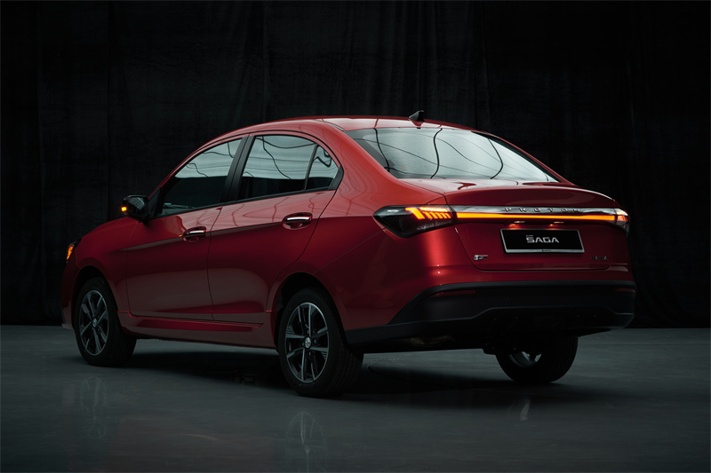 车身侧面依旧保持熟悉的紧凑比例,线条简洁而流畅。新设计的15寸双色合金轮圈强化了年轻感,同时提升稳定性。车尾部分,尾灯组采用全新光带式设计,中央镀铬饰条横贯两侧,增加层次感与视觉宽度。整体而言,新Saga的外观设计更贴近现代都市审美,同时保留了经典实用的轿车比例。