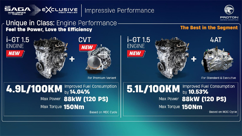 这一次,Proton 为 Saga 注入全新世代的 i-GT 1.5 引擎,在同级车中独树一帜。最大输出功率高达 120 PS(88 kW),最大扭力 150 Nm,在 A 级房车阵容里,属于“同级最强”(The Best in the Segment)。