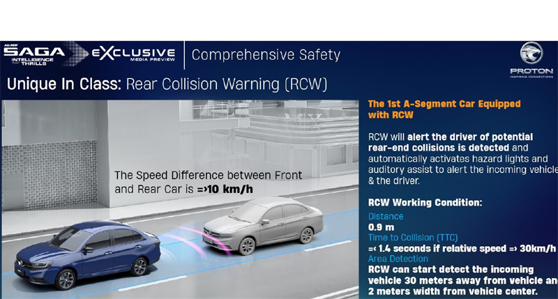 全新Saga成为同级别首款配备 Rear Collision Warning(RCW)系统的车型,这项功能的加入使其在A-Segment级距中独一无二。