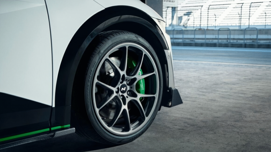 除了外观上的战斗化升级,这套 DK Edition 还配备了六活塞单体卡钳煞车系统。该系统采用铝合金加工,并搭配面积提升 54% 的煞车皮,能够在长时间激烈驾驶下依旧维持稳定的制动力,耐热性表现优异。配合降低约 15 毫米的短弹簧,车身重心进一步下移,让过弯动态更加扎实。值得一提的是,这些部件均由土屋圭市亲自测试,确保改装后的 Ioniq 5 N 能在赛道与公路上都展现令人信服的性能。