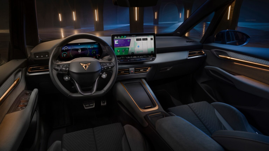 在内饰质感方面,新车采用更多高品质材料,例如麂皮饰板和柔软触感塑料,同时门板结构也进行了重新设计。四个车门把手加入照明设计,在夜间使用时更加方便。座椅部分则采用运动化桶型座椅,并可选用环保材料制成的织物,例如Seaqual Yarn或Dinamica材质。车内依然保留Cupra标志性的铜色装饰与环舱氛围灯,并增加新的动态灯光效果。