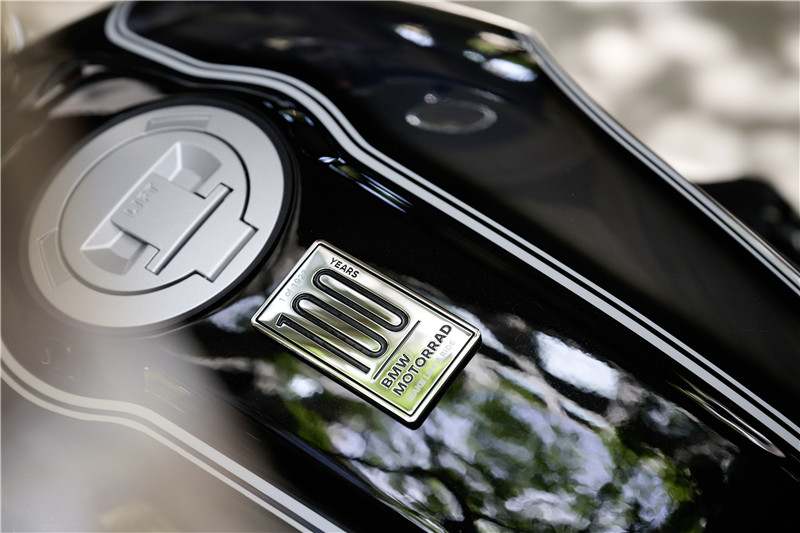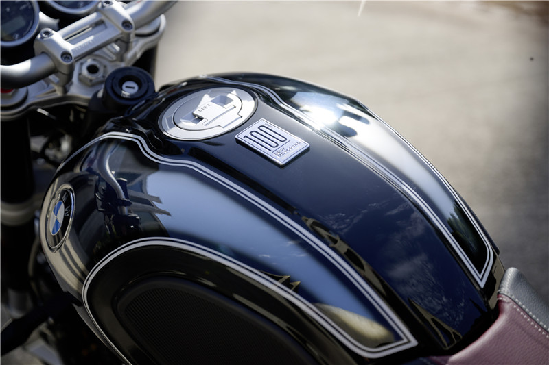 新BMW R nineT 100 Years上,油箱上黑色与铬黄及白色双线条组合体现了漆色与铬黄的复杂交互作用,并辅以油箱止滑贴和百年庆徽章。后座套上也有经典的铬黄润饰,车头挡泥板则漆上了黑色和白色双线条。整个高品质外观最后是车座上的黑/暗红双色组合。进一步辅助外观和谐感的是许多黑色组件,例如前叉管和进气口导管。