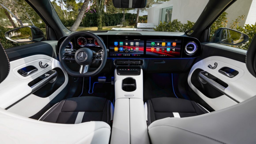 车内布局更是此次升级的重点之一。全新 GLB 采用三屏幕布局,包括 10.25 吋全液晶仪表、14 吋中控触控屏与副驾娱乐屏,整体视觉效果几乎与品牌旗舰电动车看齐。新的 MBUX 系统导入更先进的 AI 语音助手,不仅能理解更自然的语音指令,也能学习驾驶者的习惯,主动推荐功能,如导航、音乐或车内设定等。车内科技水平已经远超过去的燃油 GLB,成为品牌智能化的重要展示。