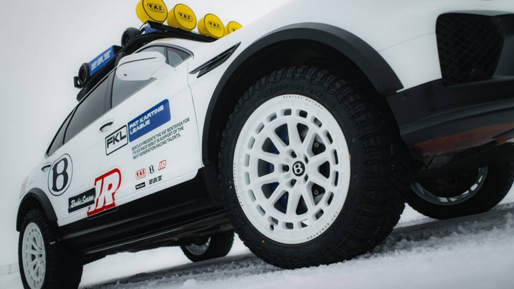 在细节配置上,这辆车同样充满“探险意味”。22英寸锻造轮圈搭配高扁平比轮胎,在雪地与碎石路面能提供更好的缓冲与抓地表现。车顶行李架与多组探照灯,让人很容易联想到长途远征或野外露营的使用场景。即便加装这些装备后,整车高度显著增加,但整体比例依旧维持宾利特有的优雅,而非刻意追求粗犷。