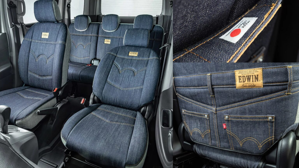 如果说外观只是开场,那么内饰才是真正的核心亮点。EDWIN 标志性的丹宁布料被大量运用于座椅表面,甚至连缝线细节都模仿牛仔裤设计。部分座椅背面还加入类似裤袋造型的装饰元素,使乘客仿佛置身于一个“牛仔主题空间”。这种将服饰文化直接带入车厢的做法,在汽车界并不常见,却意外地协调自然。