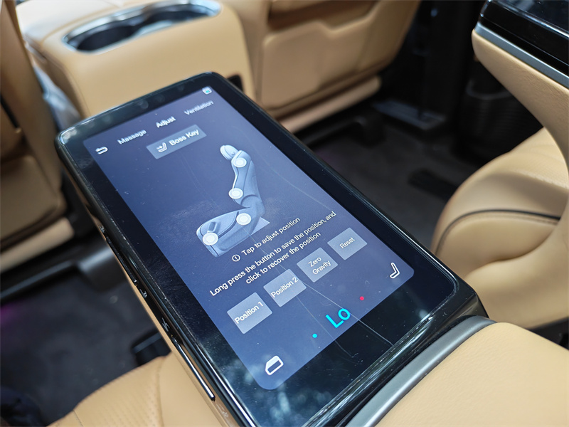 不过,真正让人意识到Denza D9与众不同的地方,是第二排。当你坐进第二排座椅时,你会很快明白,这台车的重点并不在驾驶席,而在乘坐空间本身。两张独立航空座椅提供了极高的可调节范围,从坐姿到半躺,再到接近完全放松的姿态,都可以通过电动控制轻松实现。更关键的是,这些控制并不需要通过中控屏或复杂菜单完成,而是直接整合在座椅板上的小尺寸触控屏中。