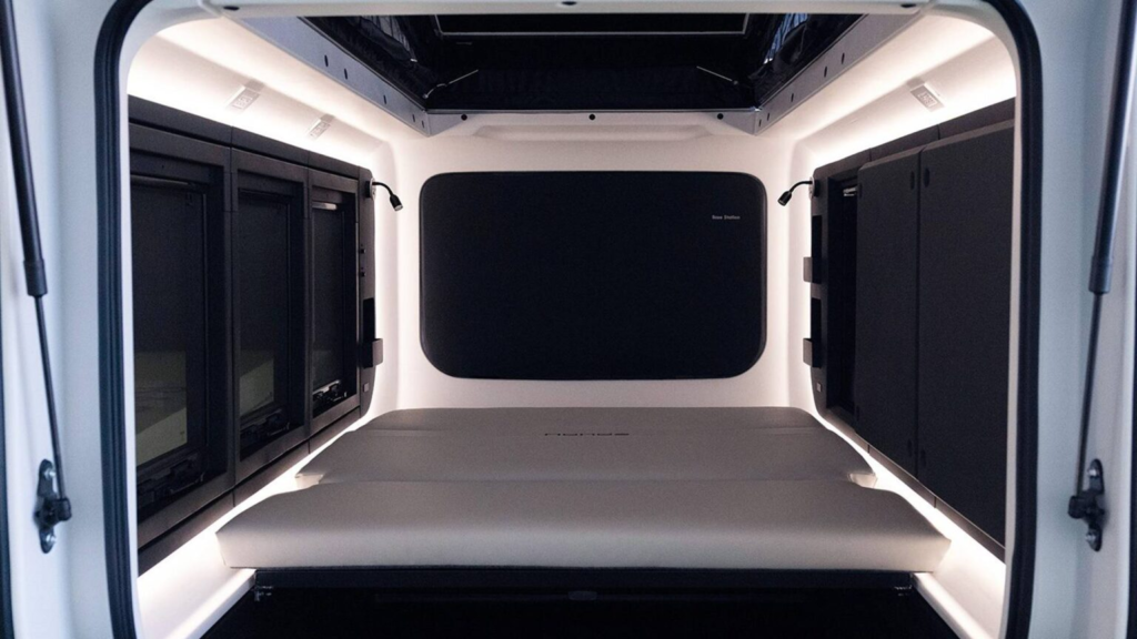 在居住机能方面,Base Station 同样贯彻“够用就好”的理念。车尾区域设有可滑出并展开的座椅结构,展开后即可形成一张标准双人床,足以应付一般双人露营需求。如果使用者有家庭出行或亲子露营的需求,还可加装上铺模块,让整体睡眠容量提升至四人左右。Honda 表示,在熟悉操作流程后,从停车到完成基本露营配置,只需短短几分钟即可完成,这对于不想花太多时间搭帐篷或布置营地的人来说,无疑极具吸引力。