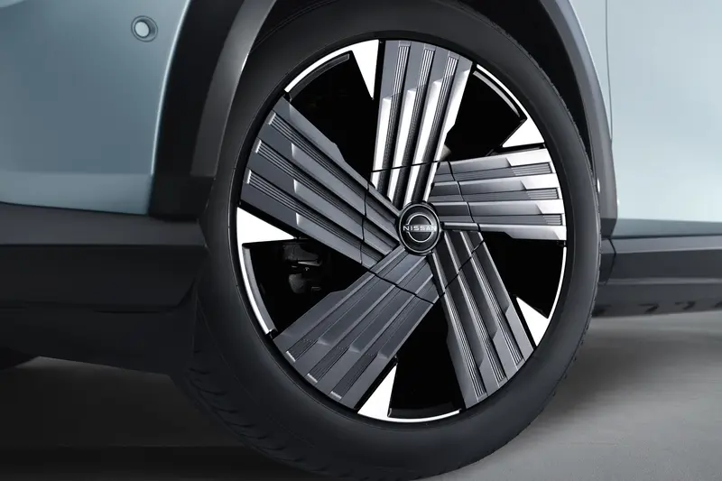 在外观设计方面,小改款 Ariya 并没有进行大刀阔斧的改变,而是以细节进化为主轴。车头延续日产电动车家族简洁流畅的设计语言,前脸封闭式造型与车身同色处理,使整体视觉更显一体化,也强化了未来感。新式样轮圈成为视觉亮点之一,通过铝合金与树脂复合工艺打造,不仅降低重量,也让侧面线条更具层次感。新追加的车色选择则为 Ariya 带来更成熟稳重的气质,呼应其旗舰定位。
