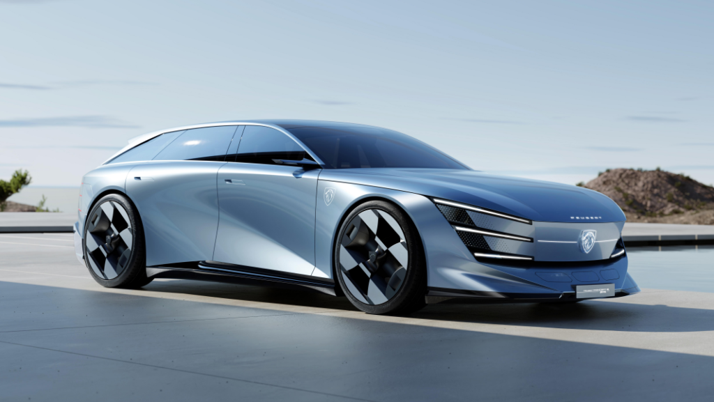 首先登场的Concept 6,可以被视为标致未来中大型电动轿车的设计蓝本。这款车并没有沿用传统三厢车比例,而是融合了猎装车与轿跑元素,打造出一种更具动感与实用兼顾的跨界造型。车身线条极为流畅,从前脸延伸至尾部形成一气呵成的视觉效果,同时通过收紧的车顶线条与独立尾翼设计,强化空气动力学表现。