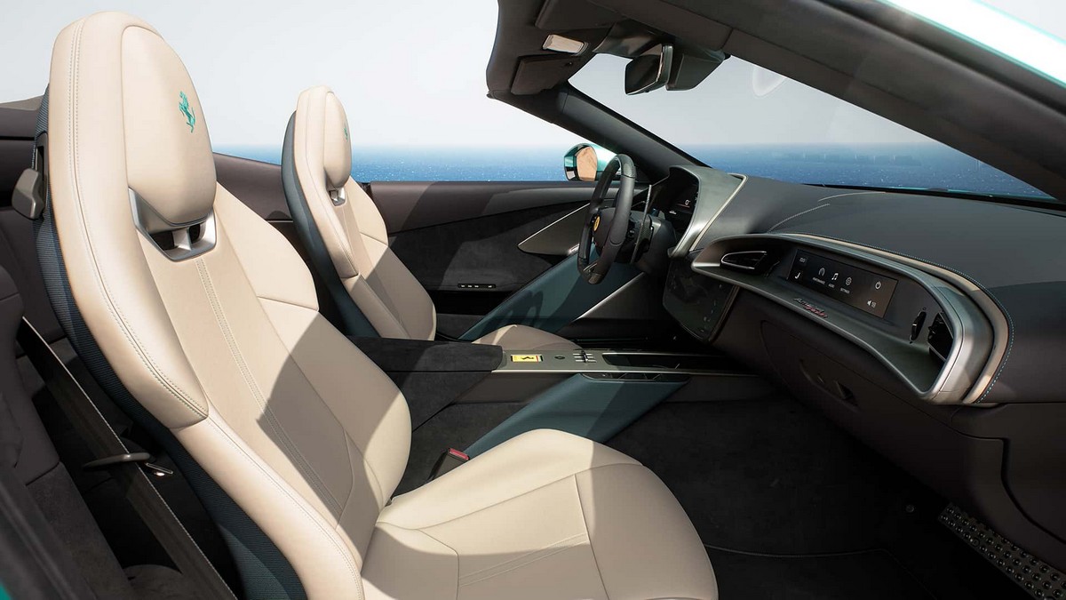 进入车内,Amalfi Spider 的内饰同样展现出 Ferrari 近年来的设计新方向。座舱采用驾驶者导向的布局,整体风格科技感明显提升。车内配备一块约 15.6 英寸的数字仪表盘,用于显示车辆速度、转速以及各种驾驶信息。中控台中央则搭载约 10.3 英寸的触控屏幕,用于控制导航、娱乐以及车辆设置等功能。此外,副驾驶前方还配备了一块约 8.8 英寸的显示屏,让乘客也能查看车辆动态信息或娱乐内容。