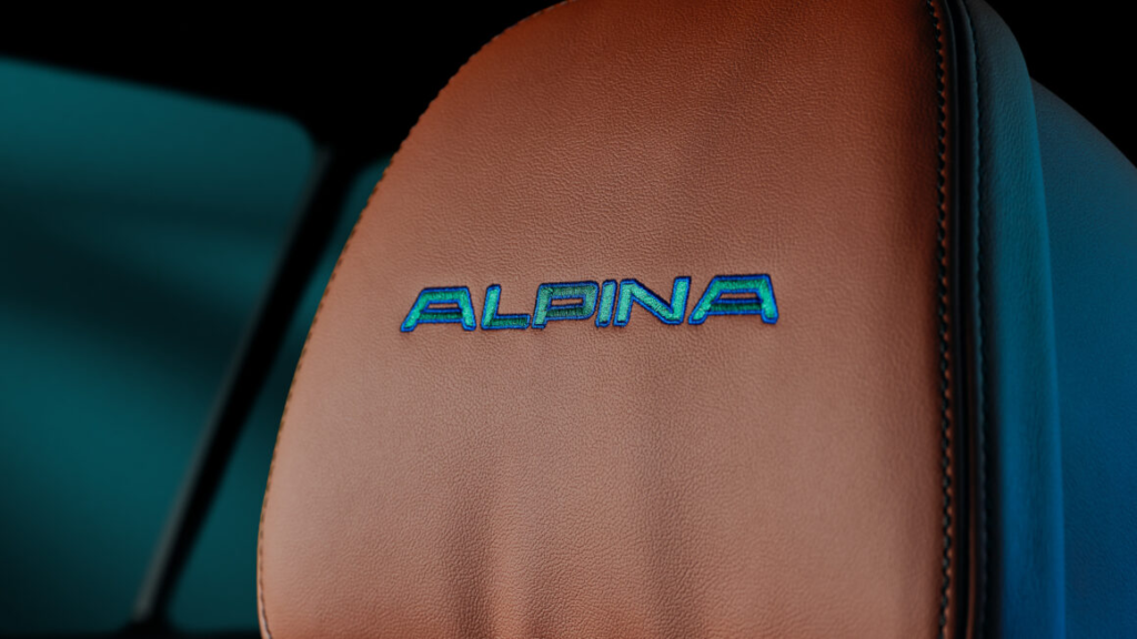 进入车内后,XB7 Manufaktur展现出极具质感的豪华座舱。整个内饰采用Tartufo Full Merino真皮包覆,搭配Alpina专属胡桃木饰板,使车厢氛围显得非常高级。头枕部分还绣有蓝色与绿色交织的Alpina徽章,与车身配色形成呼应。