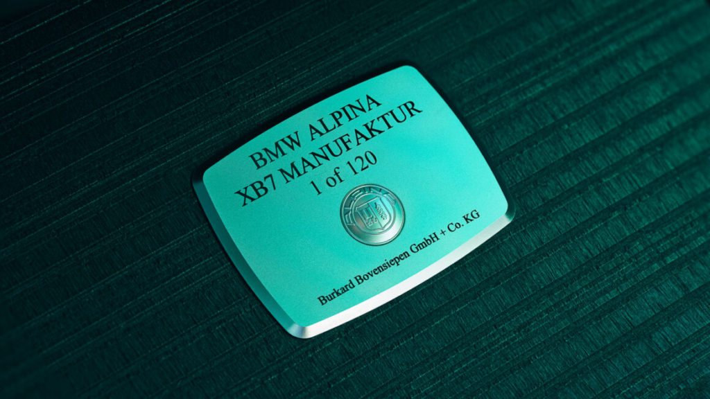 在车身颜色方面,这款限量车型提供两种专属车漆选择:Frozen Alpina Green以及Frozen Alpina Blue。这两种哑光颜色结合Alpina传统设计语言,让车辆看起来既优雅又富有个性。此外,在车尾部分还能看到“XB7 Manufaktur”的专属铭牌,而B柱位置也刻有Manufaktur字样,用以强调其限量身份。