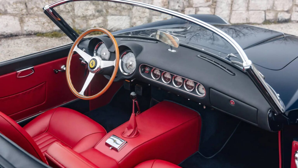 短轴版California Spider总共只生产56辆,因此在收藏市场中极为罕见。此次拍卖的车辆底盘编号为2955 GT,是该系列中的第26辆,同时也是39辆采用封闭式头灯设计的版本之一。这种配置在当时并不常见,因此更具收藏价值。
