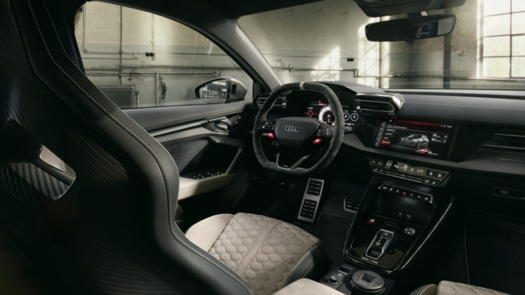 进入车内,这款限量版RS3同样展现出浓厚的运动氛围。车内配备碳纤维桶型赛车座椅,并使用Neodymium Gold金色缝线作为装饰,让内饰细节更加精致。数字仪表则采用独特的白色界面,使驾驶者在高速驾驶时能够更清楚读取信息。