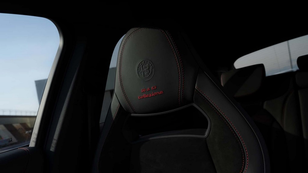 车内同样经过全面升级,营造出高性能房车应具备的热血氛围。仪表台、车门与中控区域均使用高质感皮革包覆,搭配红色缝线制造对比感。中控饰板换上碳纤维纹理,更凸显运动基因。座椅采用 Sparco 专属设计,融合皮革与 Alcantara 材质,并在头枕绣上限量编号,象征每台车辆的独一无二。整体座舱质感不仅比一般 Quadrifoglio 更豪华,也更具收藏意味。