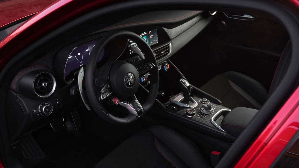 车内同样经过全面升级,营造出高性能房车应具备的热血氛围。仪表台、车门与中控区域均使用高质感皮革包覆,搭配红色缝线制造对比感。中控饰板换上碳纤维纹理,更凸显运动基因。座椅采用 Sparco 专属设计,融合皮革与 Alcantara 材质,并在头枕绣上限量编号,象征每台车辆的独一无二。整体座舱质感不仅比一般 Quadrifoglio 更豪华,也更具收藏意味。