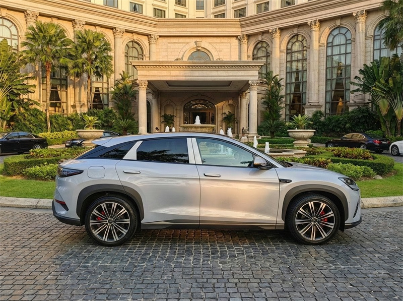 车侧轮廓紧凑,溜背式 SUV 线条让整台车看起来比传统中型 SUV 更动感。Performance 版本配备的大尺寸轮圈与性能取向轮胎,在视觉上已经明确表态:这不是一台只为代步而生的电动车。