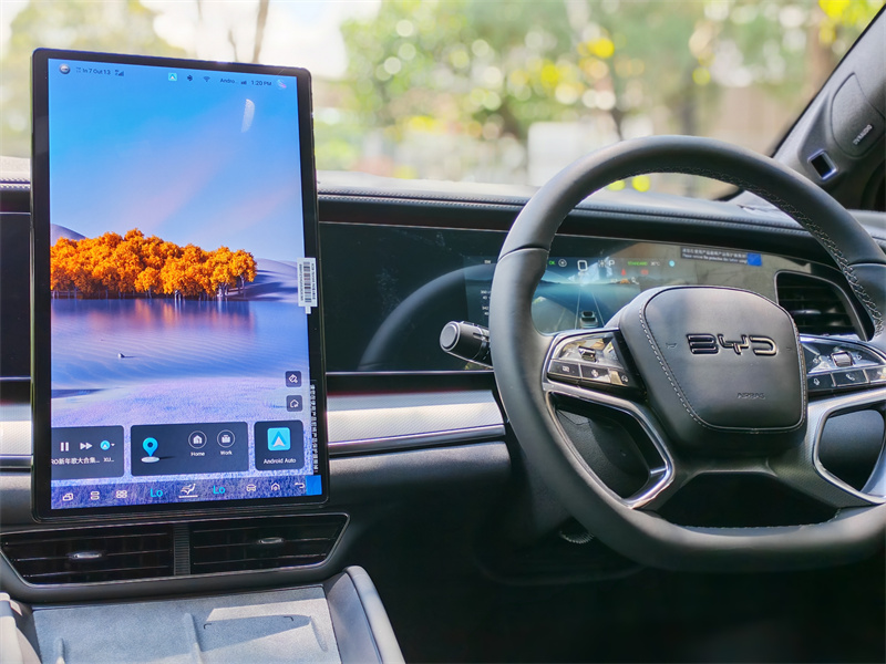 座舱的视觉核心,是那块 15.6 英寸的大尺寸中控触控屏。这不仅是同级中非常醒目的配置,更重要的是,它保留了 BYD 标志性的可旋转设计。