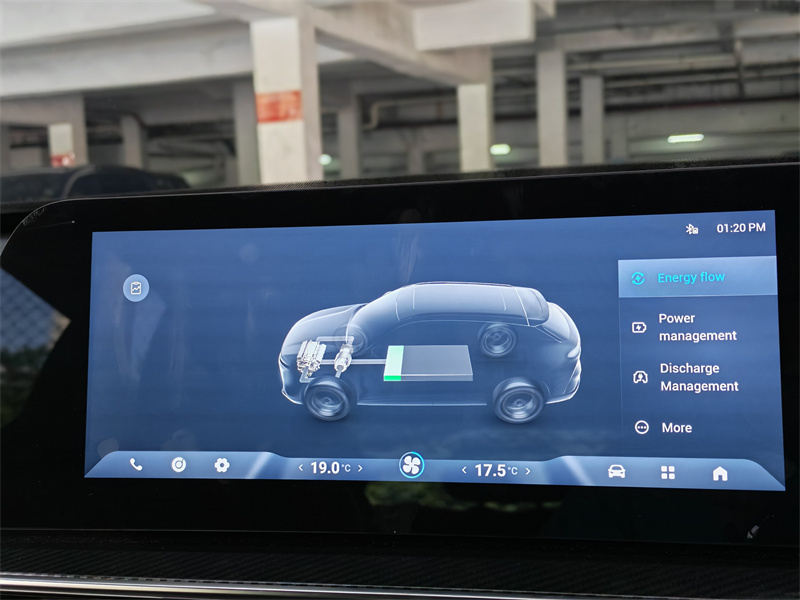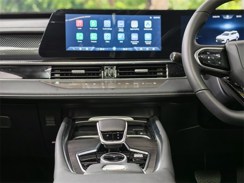 中控台采用双 12.3 英寸一体式大屏布局,仪表与中控连成一体,视觉统一感很强。仪表盘的信息显示重点明确,车速、续航、能量流向等信息一目了然;中控屏的菜单层级清晰,常用功能不需要反复翻找。
