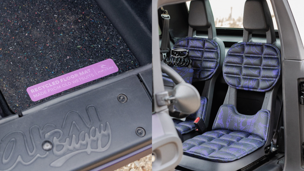 而内饰设计也贯彻“户外精神”。Ami Buggy全车采用耐用防水材料,座椅使用可清洗织物并加入黄色点缀,脚踏区域铺设防滑橡胶地垫。Citroën还在车内配置便携式防水储物袋、快拆淋浴布垫、以及用回收潜水衣料制成的随身包,让驾驶者即使满身沙子也能轻松收拾再上路。这些细节不仅实用,也充分体现了品牌对“环保”与“再生材质”的坚持。