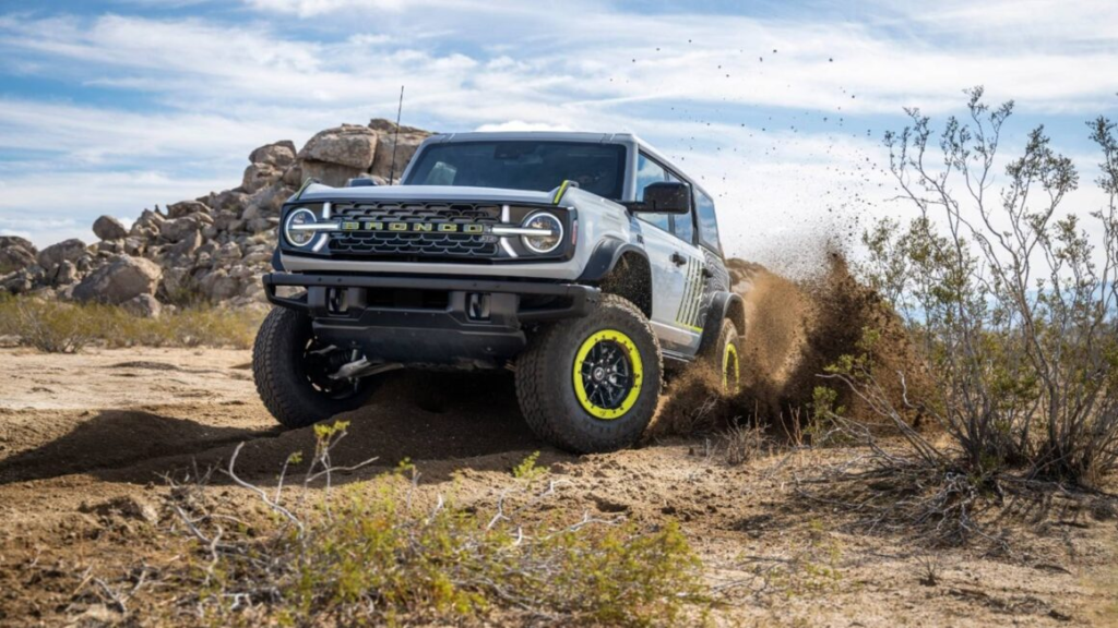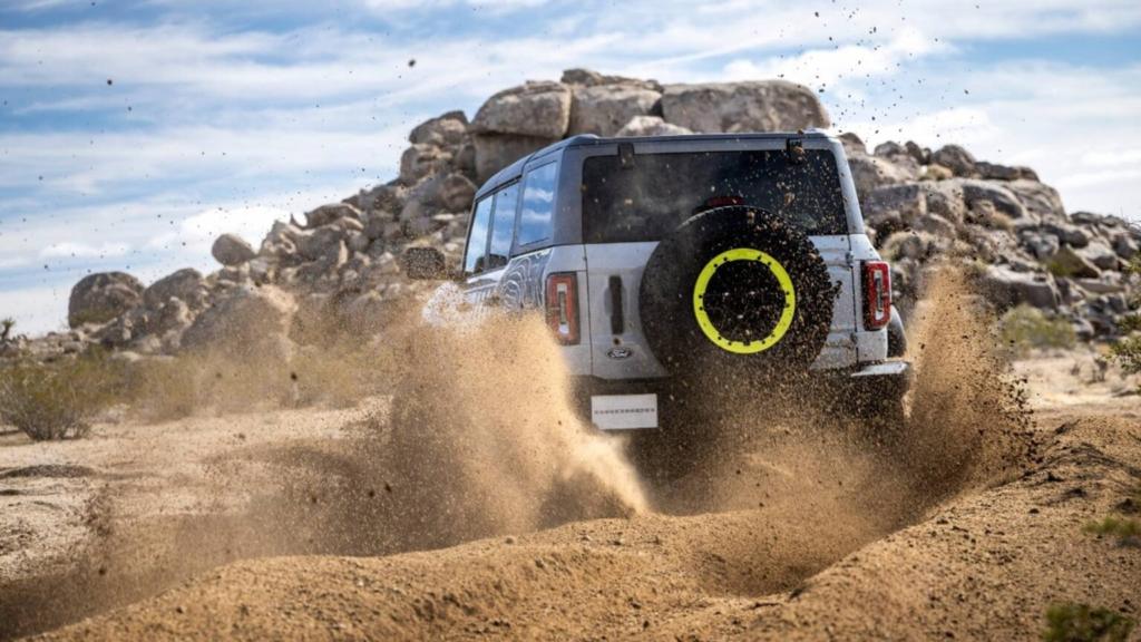Bronco RTR 的开发并非纸上谈兵,而是经历了大量严苛实地测试。Ford 团队选择了美国著名的 Johnson Valley 越野区域作为主要测试场地,这里以高速碎石路、沙丘以及极端地形闻名,是检验越野车耐用度与操控稳定性的理想环境。整车调校过程中,Ford 邀请了多位经验丰富的越野与拉力赛好手参与,包括在越野与漂移领域都极具声望的 Vaughn Gittin Jr.,确保这款车不仅在数据上好看,在真实驾驶中也能经得起考验。