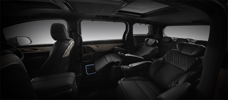 前排座椅采用 Nappa 真皮,并具备通风功能,驾驶座更配备 10 点式按摩系统;第二排为零重力独立座椅,支持一键调节;第三排同样具备成人友善的空间与坐姿,使整车兼顾家庭与商务用途。