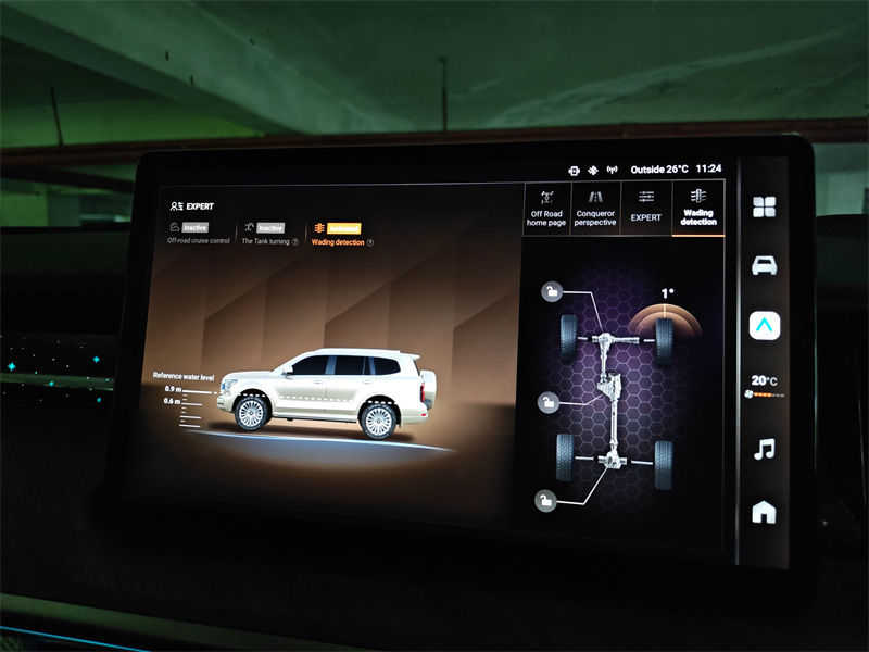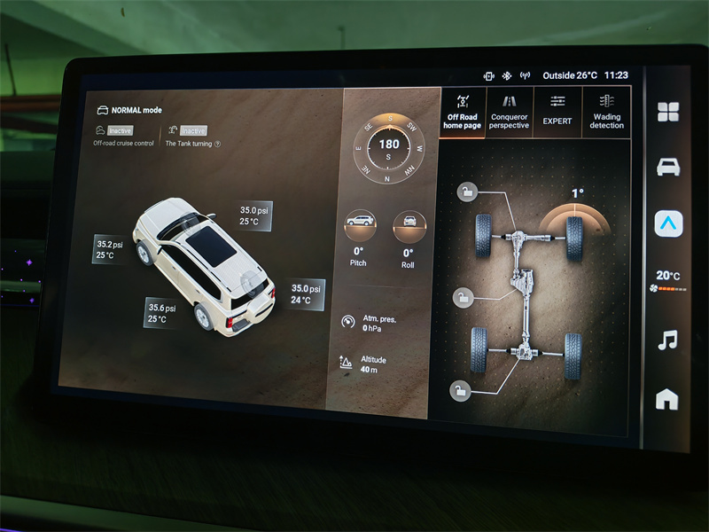 Tank 500 HEV 的越野电子功能也非常实用,车上的**多地形模式(包括泥地、沙地、岩石等)**让驾驶者在进入不同路面前不必擅自猜测参数,系统会自动匹配节奏、牵引力控制以及换挡逻辑。在泥地时允许适当打滑以便轮胎清理泥土;在沙地时优化扭矩输出避免深陷;在岩石模式下则偏向开低速档、频繁用发动机扭矩配合差速锁,配合低速四驱让车辆缓慢爬行。这样的电子“预设”对于非专业越野手来说非常友好,它等于把一部分越野经验以软件形式封装,让普通车主也能完成不那么极限但需要技巧的路线。