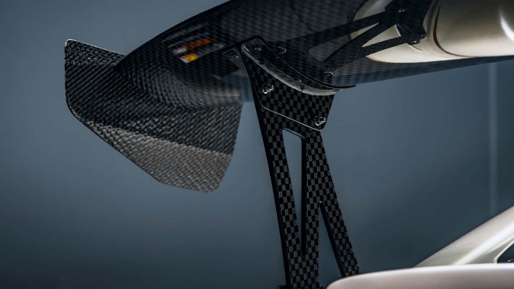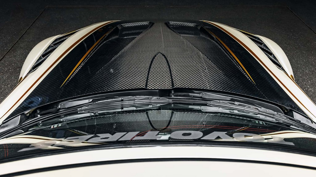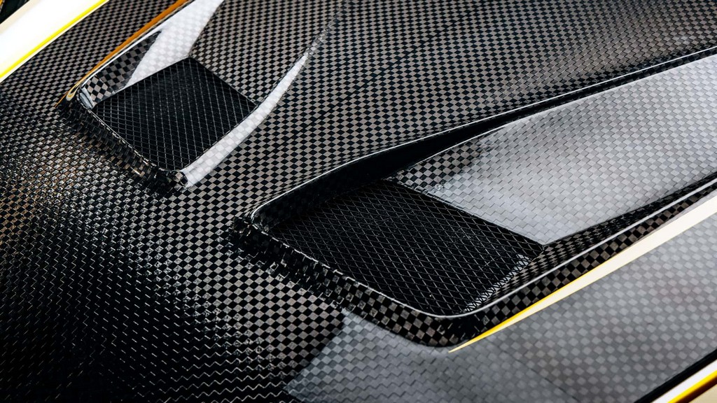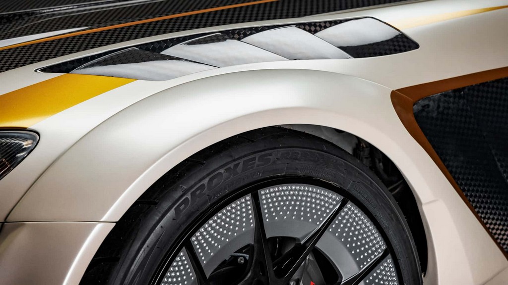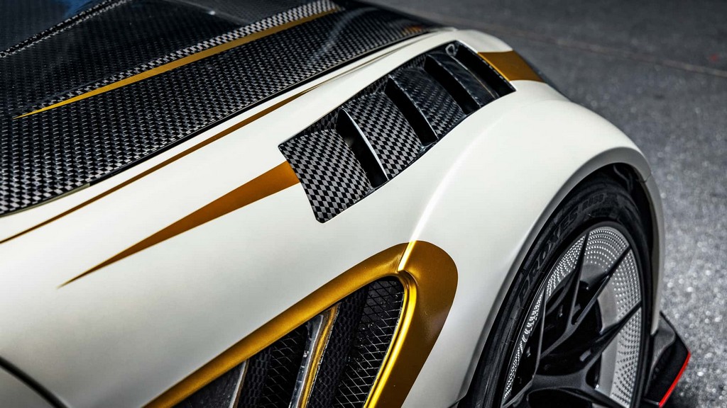 车头的锐利进气口与巨大的尾翼让人一眼便知这是为赛道而生的猛兽。车漆采用来自Lamborghini的Balloon White珍珠白,在阳光照射下闪烁出银白与蓝色交织的光泽,视觉效果惊艳。