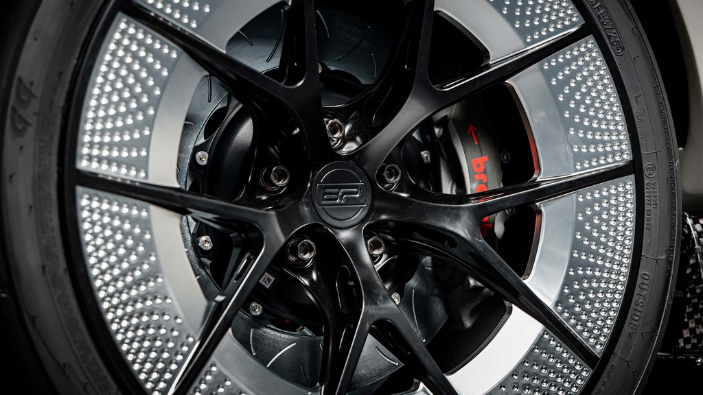 制动系统升级为Brembo Pista竞技级刹车系统,前六活塞、后四活塞卡钳搭配打孔碟盘,刹车手感犀利直接。为了进一步提升抓地力,轮圈换上19寸锻造轻量化BP-RW Evolution铝圈,搭配295/30ZR19高性能胎。