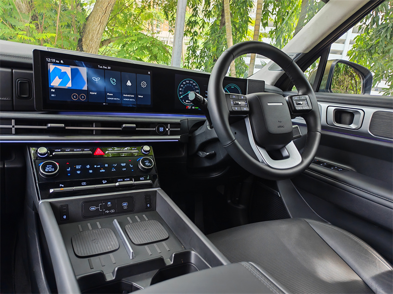在城市低速行驶中,它几乎不像一台传统 SUV。电机在起步阶段的介入非常自然,你不会感受到明显的发动机介入点,也不会有顿挫或突兀的动力切换。这种平顺性,非常接近日本混动车型给人的体验。