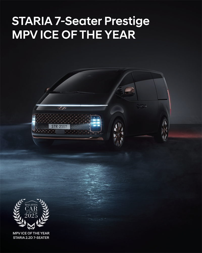 吉隆坡,2025 年 1 月 23 日 —— Hyundai Motor Malaysia 今日宣布,旗下未来感 MPV 车型 Hyundai STARIA 在 2025 年马来西亚年度车型大奖(Malaysia Car of the Year,MCOTY) 中取得亮眼成绩,其中 STARIA Prestige 7 座版本 荣获 “年度燃油 MPV(MPV ICE of the Year 2025)” 殊荣。这一奖项不仅肯定了 STARIA 在舒适性、安全性与实用性方面的整体表现,也进一步巩固其在马来西亚 MPV 市场中的强势地位 [NOTE TO EDITOR] Hyundai STARIA…。