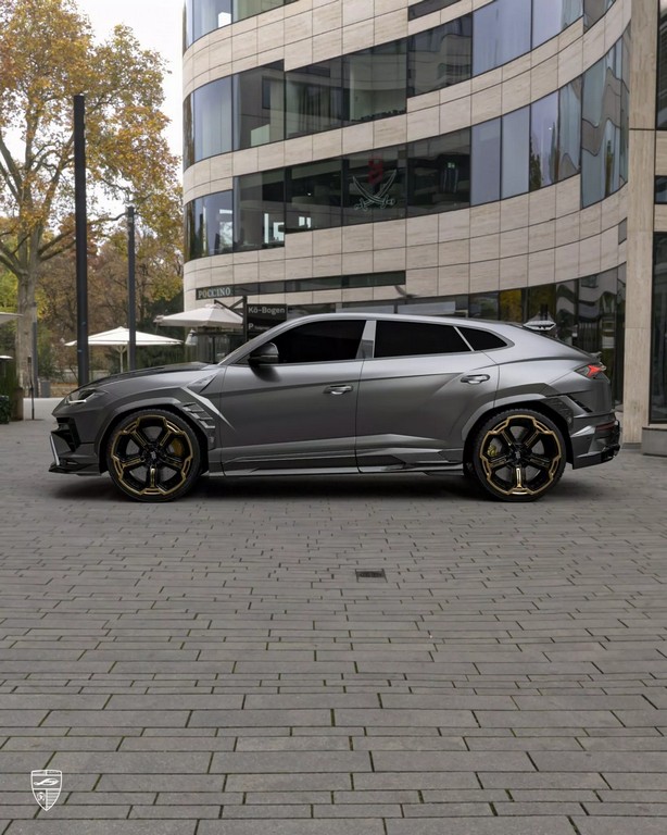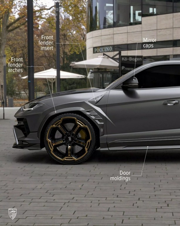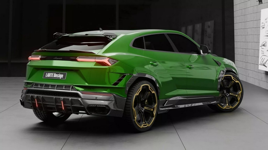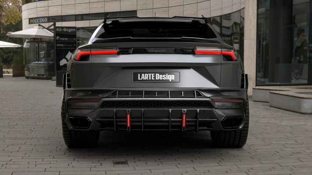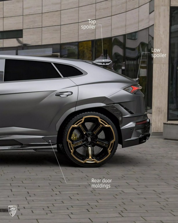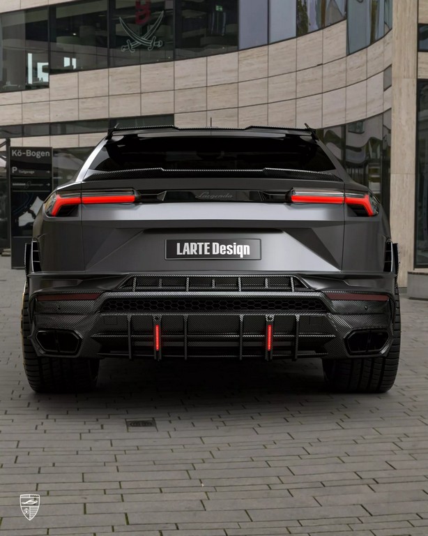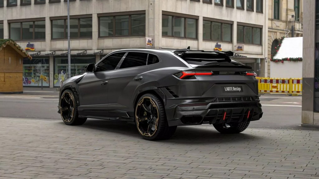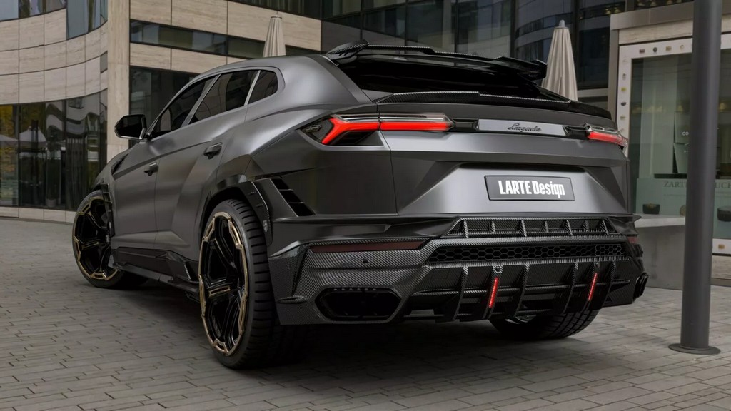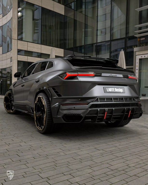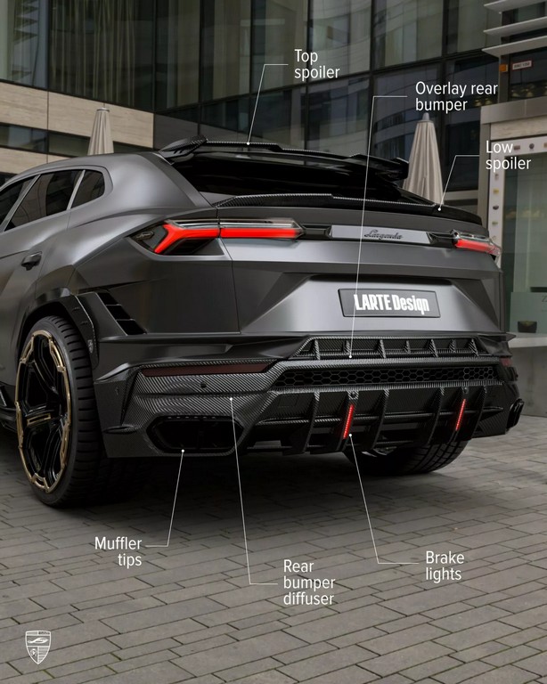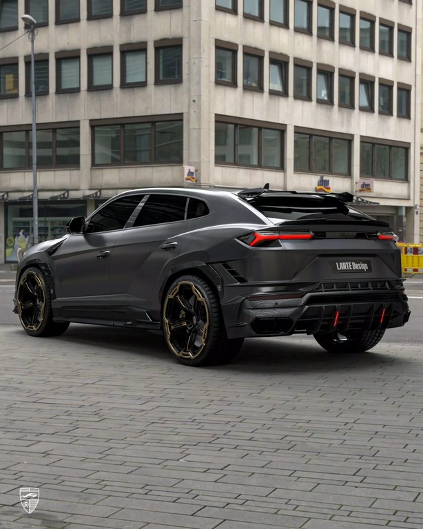 车侧同样经过雕塑般的重新构造——碳纤维侧裙与加宽轮拱增强了肌肉感,后视镜盖采用亮面碳纤设计,与车身黑金双色锻造轮圈相呼应。至于车尾,Larte 为其打造全新尾翼系统,包含车顶小型扰流片与后保险杠一体式扩散器。尾灯下方的纵向LED刹车灯与四出排气系统共同构成视觉焦点,使 Urus 的尾部张力更强。整体造型既保留 Lamborghini 狂野的灵魂,又加入德系精密工艺的克制与秩序。