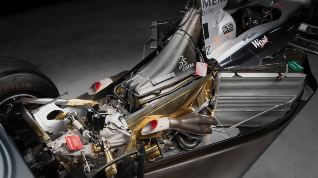 MP4-17 系列由 F1 设计大师 Adrian Newey 主导开发,是 McLaren 在新世纪初期的重要作品。整体设计延续了前代赛车的核心理念,同时针对空气动力学、底盘刚性与重量分配进行优化,使其在高速稳定性与操控精准度之间取得更佳平衡。动力系统方面,这辆赛车搭载 3.0 升 V10 自然进气引擎,由 Mercedes-Benz 与 Ilmor Engineering 联合打造,在当年以高转速、线性输出和可靠性著称,是 Ferrari 引擎最具威胁的对手之一。