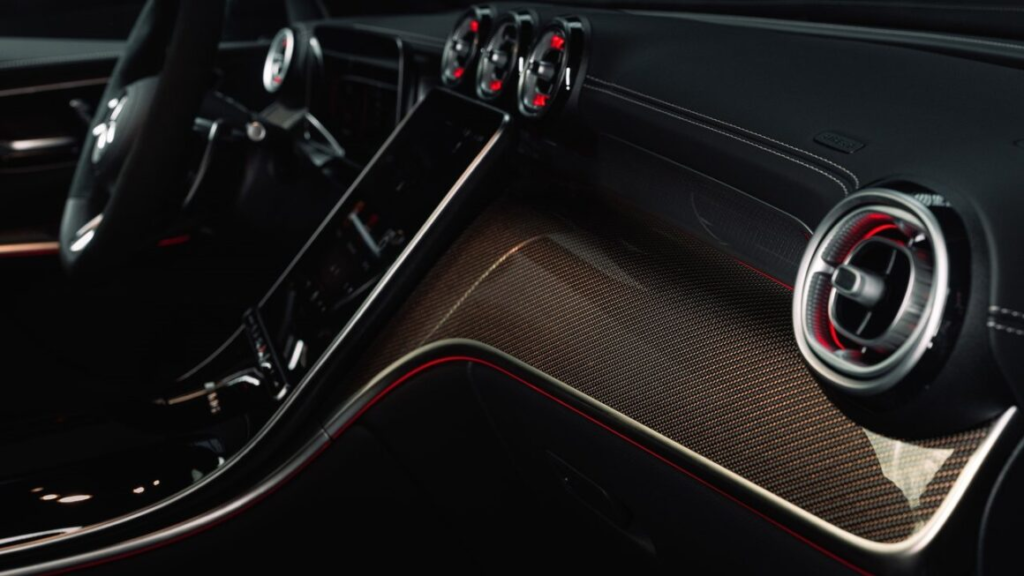 内饰部分同样强调性能与豪华的结合。车内配备AMG专属运动座椅,并采用高级皮革与碳纤维饰板打造出极具质感的座舱氛围。部分细节还融入金属编织元素,与外观设计相呼应,整体风格既现代又富有运动气息。同时,车内科技配置也保持高水准,提供完善的信息娱乐与驾驶辅助系统,提升日常使用的便利性。