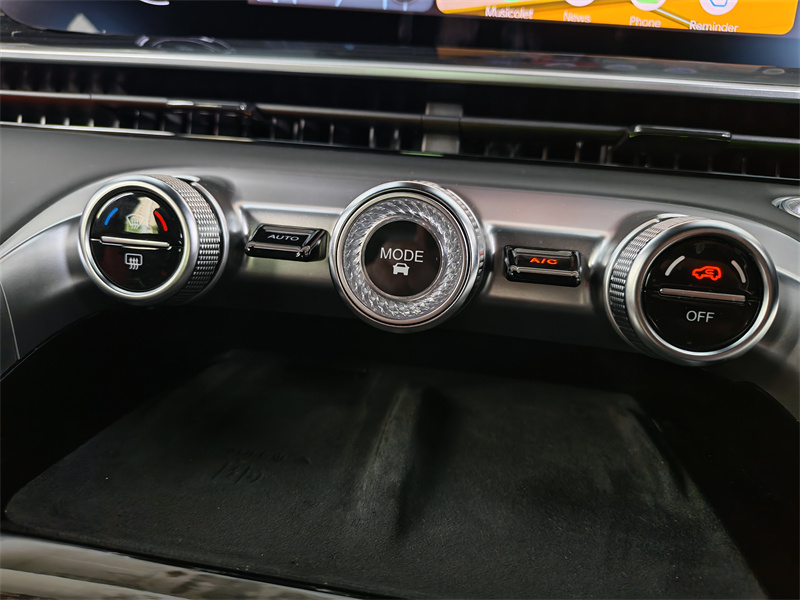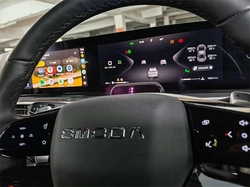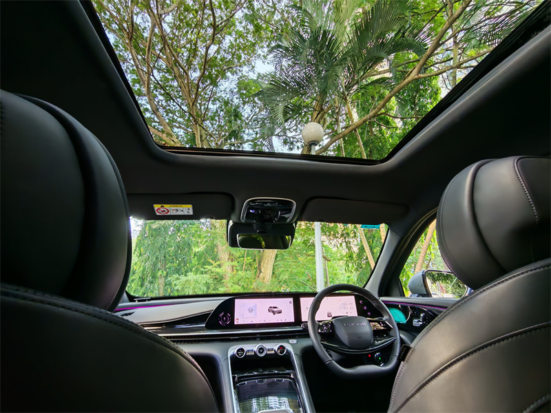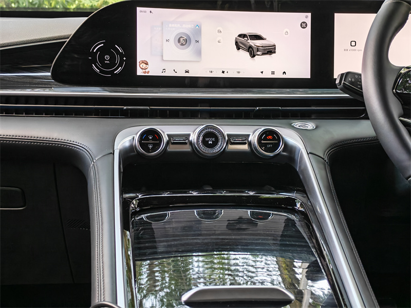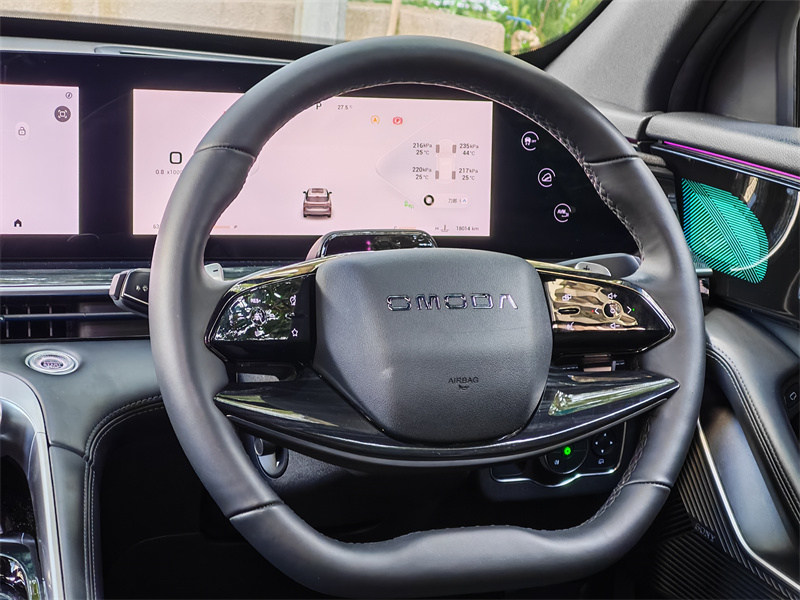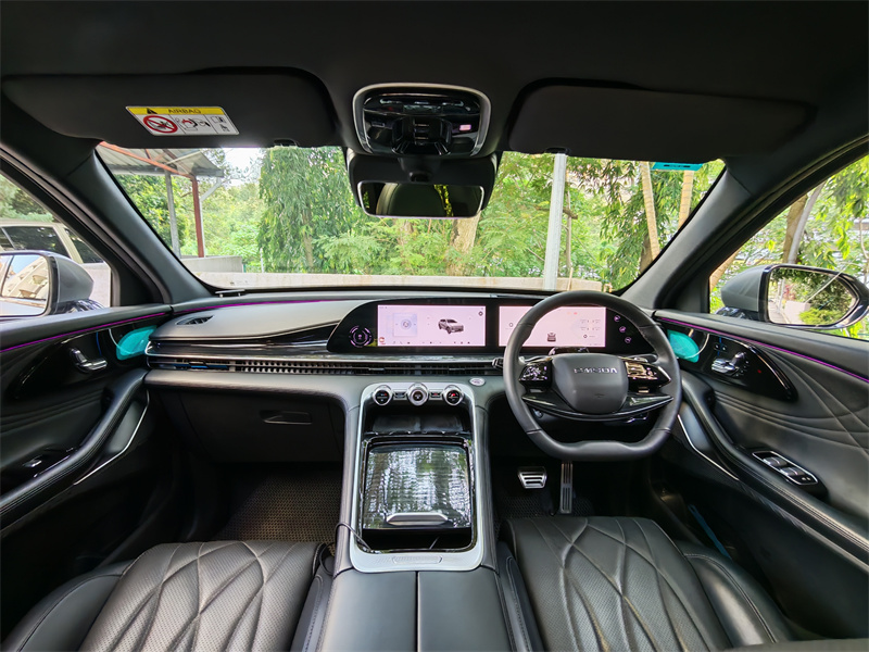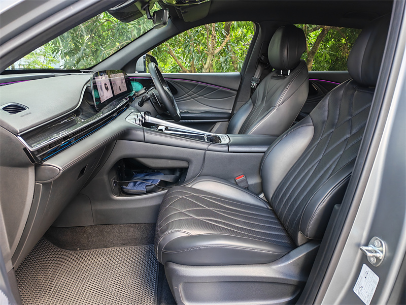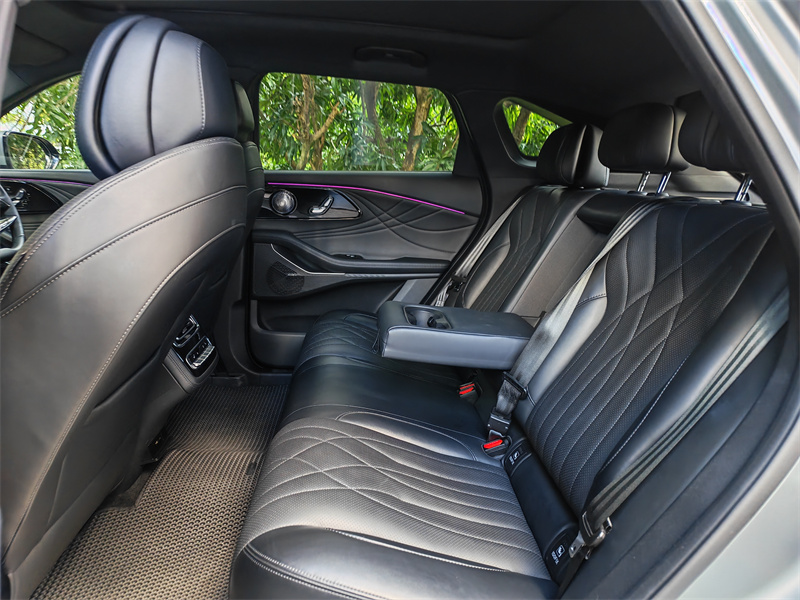 进入车内,气氛与外观一样令人惊喜。大面积的真皮与软质材料覆盖触手可及之处,细腻的缝线与金属饰板提升了豪华氛围。中控台采用悬浮式双联屏设计,清晰细腻,操作逻辑直观。12 扬声器的高保真音响系统(配合数字功放)让音乐在车厢里环绕流淌,低频沉稳有力,高音清澈,仿佛每一次驾驶都伴随一场私人音乐会。全景天窗带来的通透感,让车厢空间更加开阔;无论白天还是夜晚,车内氛围灯的细腻变化,都在提醒你这不是一台冰冷的机器,而是一个有情绪、有温度的出行伙伴。