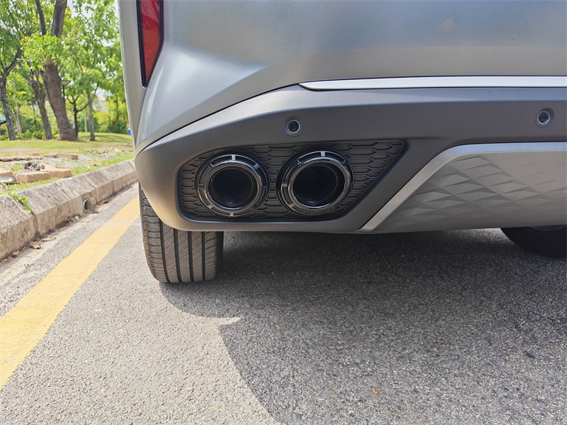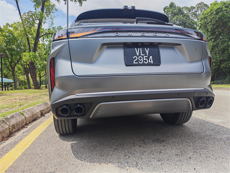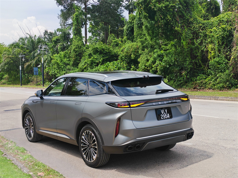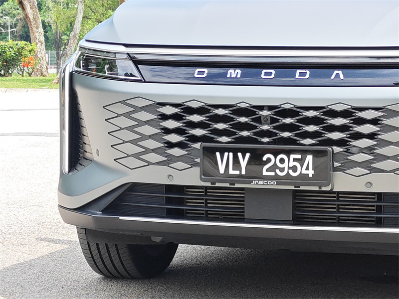 前脸的六边形大尺寸进气格栅采用了点阵式设计,与两侧狭长锐利的 LED 大灯相连,形成凌厉的视觉冲击。贯穿式的尾灯点亮时极具科技感,配合双边排气饰口和肌肉感十足的轮拱线条,整个车身散发着力量与优雅并存的气息。站在它面前,你会忍不住联想到欧洲高端品牌的旗舰 SUV,却又感受到 Omoda 赋予它的年轻与大胆。