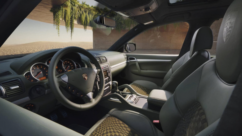车内的改造则完全走另一种路线——复古、优雅、带故事感。整个座舱换上 English Green 真皮,呈现柔和又高级的绿色调,而最吸睛的莫过于座椅中央采用的经典“Pasha 格纹布料”,这种黑绿棋盘格纹最早出现于 1970–1980 年代的 Porsche 车型,是复古车迷心中的标志性元素。如今它以现代工艺重现在 Cayenne 上,让座舱宛如时光倒流。同时,中控台与门板加入拉丝铝饰条,融合复古与现代,又不会显得突兀,这让整车具有丰富层次感,也让人感受到定制化的深度与诚意。
