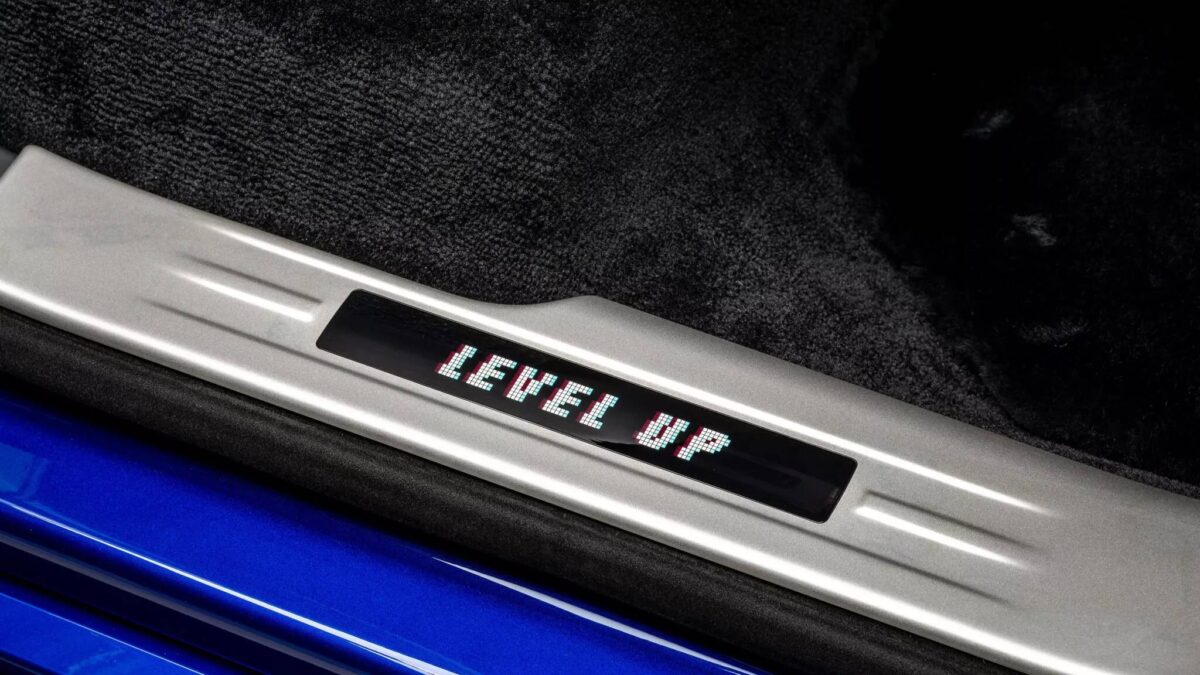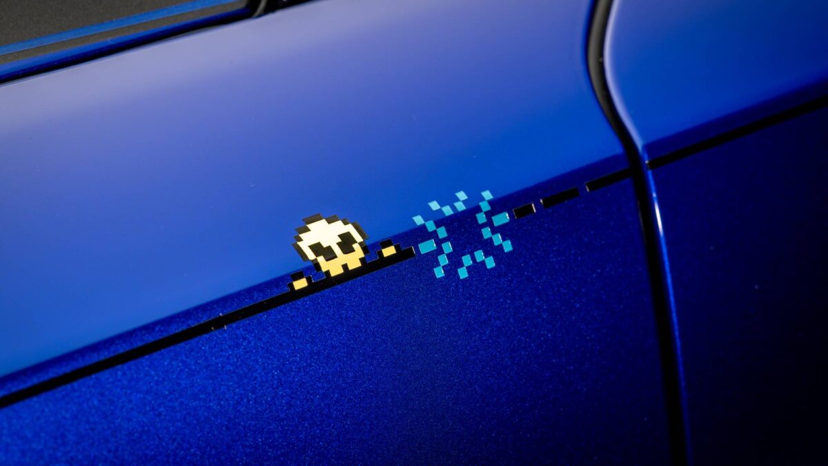 车身外观分为上下双色,上半部以黑色基础搭配极细腻的水晶涂层,让车身在光线下呈现独特的霓虹折射效果,仿佛街机机台的玻璃反射。下半部采用 Salamanca Blue 深蓝色,并以多层喷涂确保饱和度与光泽感。最大亮点是车侧手绘 Coachline,当中的像素外星人(Cheeky Alien)由 89 个 3mm 小方格绘制而成,左右两侧采用不同爆破色调,一边为粉紫霓虹风,一边为黄蓝像素风,呈现双面视觉效果。