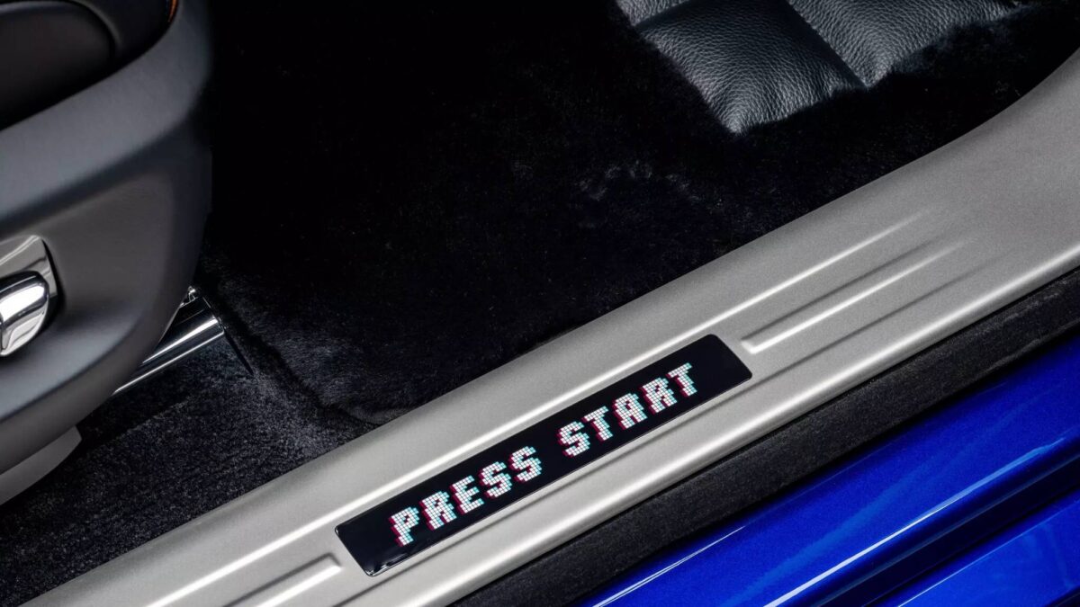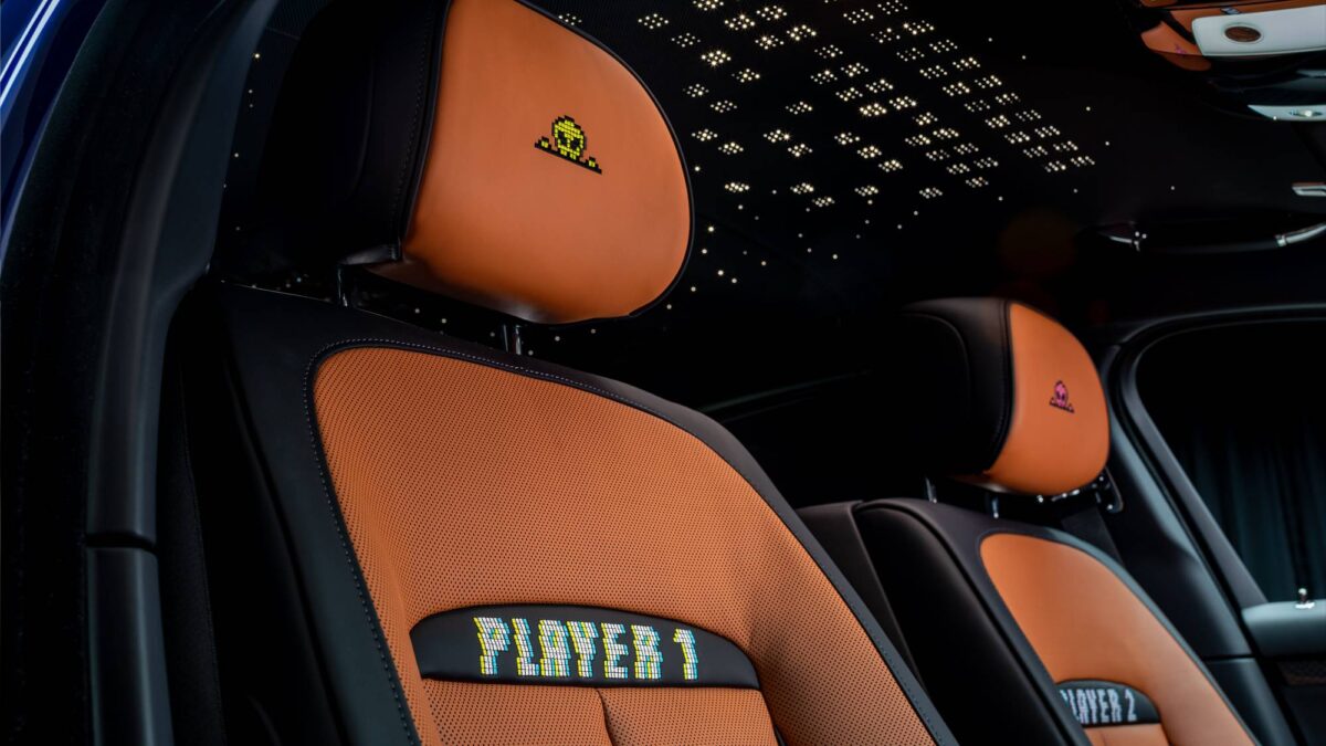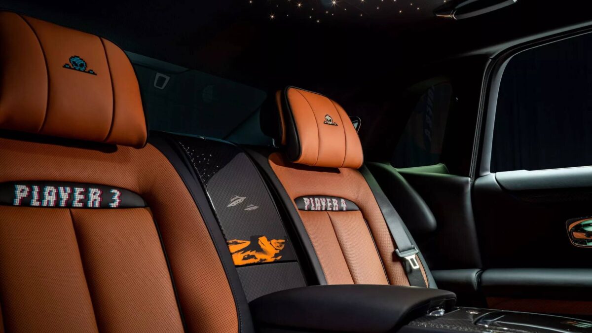 打开车门后,会让任何热爱复古电玩的人瞬间沉浸其中。四个座位分别绣上 “Player 1” 至 “Player 4”,字体全部采用 8-bit 像素风格。门槛饰板上出现醒目的 “PRESS START”,令人联想到投币后游戏开始的画面。后排中控饰板上则镶嵌两艘金属 UFO 图案,旁边是月球地表与星空背景,呈现典型街机冒险主题。整个车内氛围宛如移动的怀旧游戏厅,但又保留 Rolls-Royce 一贯的宁静与豪华触感。
