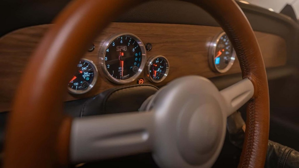 进入车内,SP40 的内装同样是一种时代融合的美学。座舱以复古跑车为灵感,大量使用手工真皮、抛光金属与木质饰板,让人仿佛坐进了 1930 年代的工艺作品。但在怀旧之间,它却又不牺牲现代使用体验。仪表盘采用复古圆表造型,但内部科技经过现代化处理,使读取信息更清晰。车内还提供无线充电等现代便利配备,让驾驶者在体验经典氛围的同时,也能享有当代科技带来的舒适性。