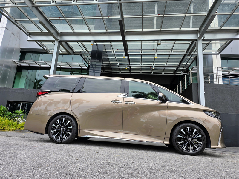 车身侧面线条流畅而稳重,配有电动滑动门,既提升了便利性,也增强了车辆的豪华感。19英寸的大尺寸轮毂为车辆注入了一丝运动气息,使其在商务场合中既显稳重,又不失现代感。