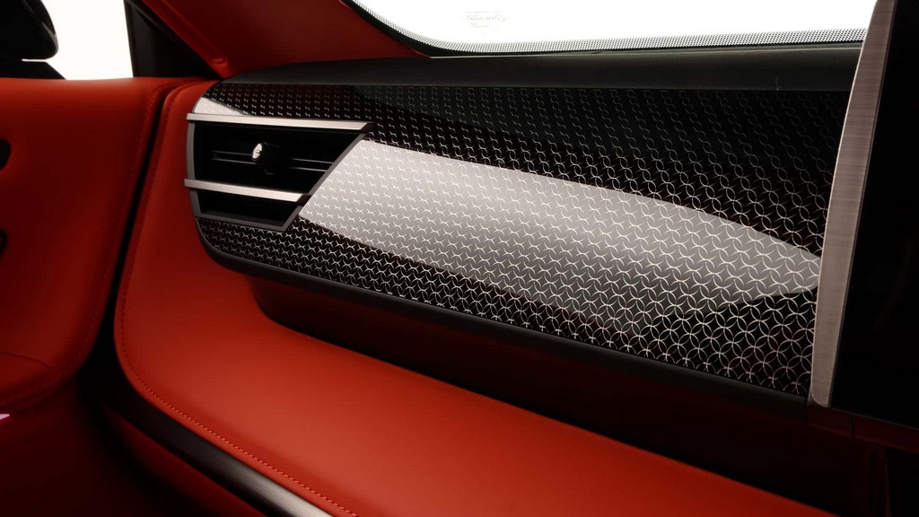 Century Coupe 概念车的登场让人眼前一亮。外观上,它舍弃了传统四门旗舰的庄重线条,转而以双门跑格的 Coupe 姿态诠释新奢华。修长的车身比例、低趴的车顶轮廓与宽体姿态完美结合,展现出优雅与力量并存的气场。车身采用独特的 手工多层漆工艺——官方称多达 60 层喷涂,每一层都由匠人反复打磨与烘干,形成深邃而细腻的光泽。展示车采用耀眼的 橙红色(Amber Flame Red),在灯光下流动如液体金属般闪耀。