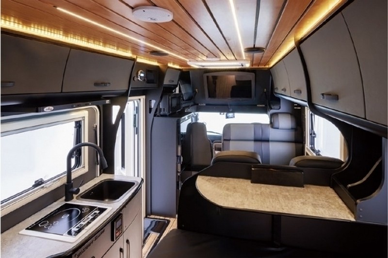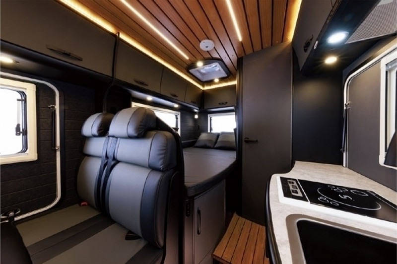 进入车舱后,整车内饰宛如高级酒店客房。TRIP BLACK EDITION 的空间布局经过精密规划,后舱配备固定双人床,尺寸约 1980 × 1360 毫米,床垫厚实柔软,可轻松容纳两位成人平躺休息。床下是隐藏式储物舱,用于放置行李与露营装备。车内饰面采用深色木纹与皮革包覆,搭配柔光灯带营造温暖氛围。厨房区、餐桌区与洗手台完美整合,甚至配有可调高度的餐桌,只需放上垫子就能变成 1670 × 1000 毫米的临时床铺。