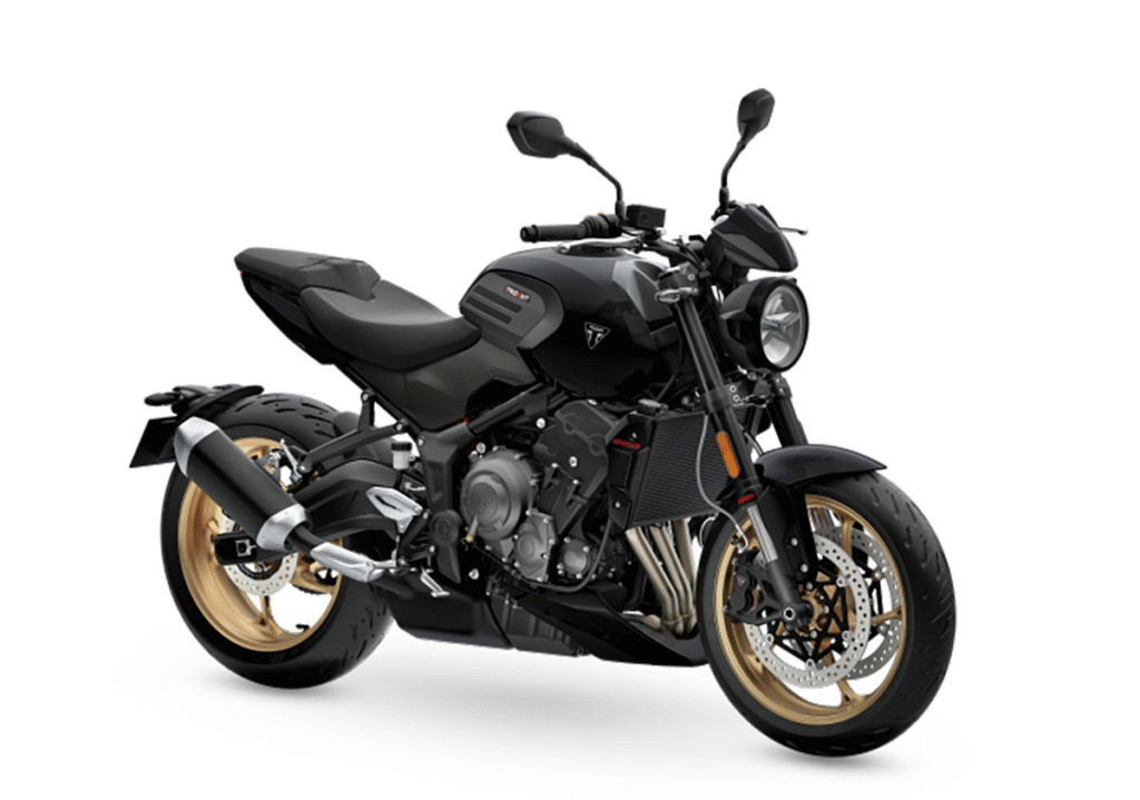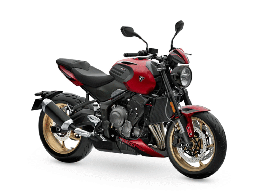 油箱盖下方印有立体浮雕的“Triumph”字样,彰显品牌工艺。轮圈采用金色涂装,搭配三种车身配色——Ash Grey、Carnival Red及Jet Black——展现高端与运动并存的个性。