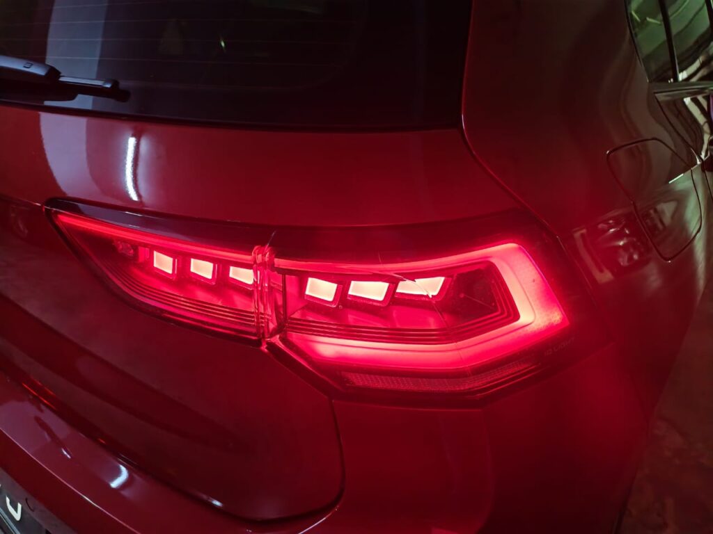 车头依旧低伏,GTI 专属红色饰条横贯前脸,与全新的 IQ.Light LED 矩阵大灯融为一体。这组灯不仅视觉辨识度更高,夜间照明的精准度与分布也更细腻,属于那种你一旦习惯,就回不去普通灯组的配置。